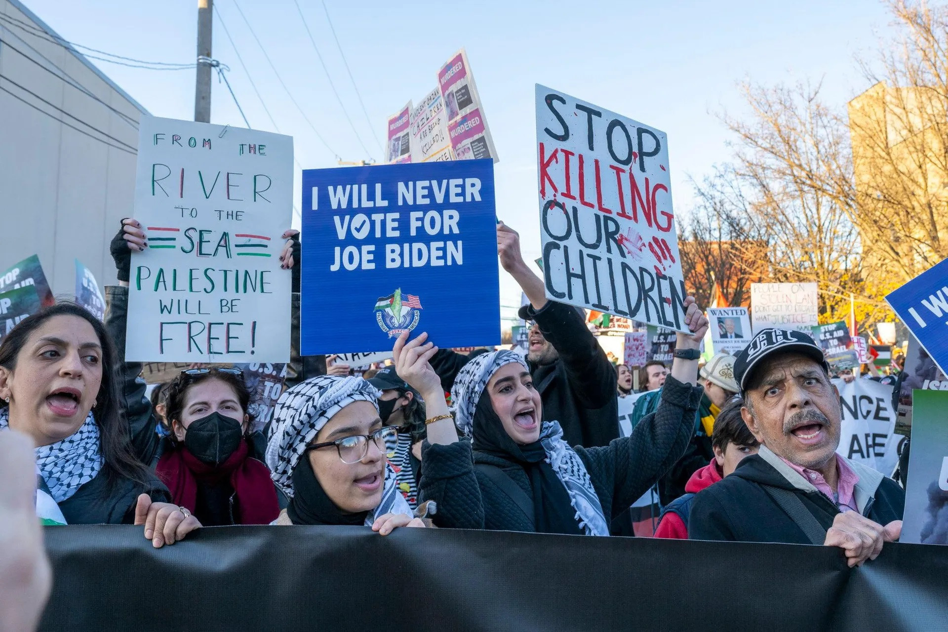 “İsrailə silah tədarükünü dayandırın”, “Qəzzada soyqırımı dayandırın” və “Qəzzanın blokadasına son qoyun” şüarları yazılmış plakatlarla yürüşə gələn etirazçılar, xüsusən də İsrailin baş naziri Benyamin Netanyahunu anklav sakinlərinə qarşı soyqırımda, ABŞ prezidenti Co Baydeni isə ona kömək etməkdə ittiham edirlər.