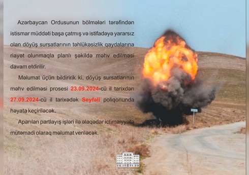 "Azərbaycan Ordusunun bölmələri tərəfindən istismar müddəti başa çatmış və istifadəyə yararsız döyüş sursatlarının təhlükəsizlik qaydalarına riayət olunmaqla planlı şəkildə məhv edilməsi davam etdirilir. Döyüş sursatlarının məhv edilməsi prosesi 09.09.2024-cü il tarixdən 13.09.2024-cü il tarixədək Seyfəli poliqonunda həyata keçiriləcək", - məlumatda deyilir.