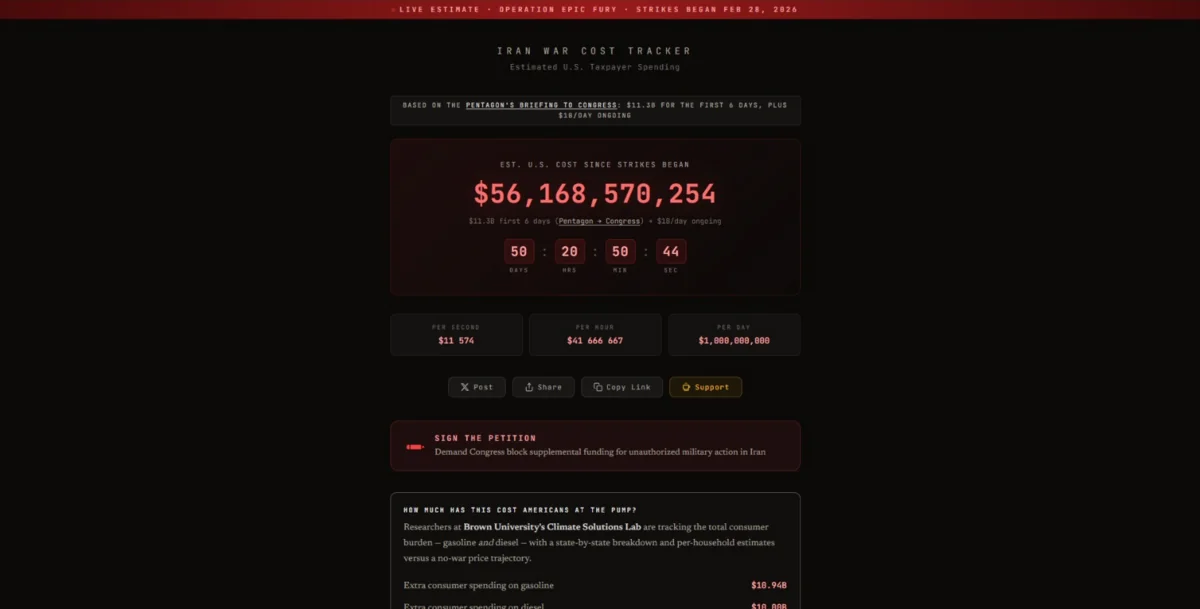 Real vaxt rejimində izləmə resursu Pentaqonun 10 martda ABŞ Konqresi üçün keçirdiyi brifinqdən əldə edilən məlumatlara əsaslanır. Brifinq zamanı bildirilib ki, Vaşinqton Yaxın Şərqdəki döyüş əməliyyatlarının ilk altı günündə 11,3 milyard dollar xərcləyib və münaqişənin sonrakı hər günü üçün təxminən 1 milyard dollar xərcləməyi planlaşdırır.