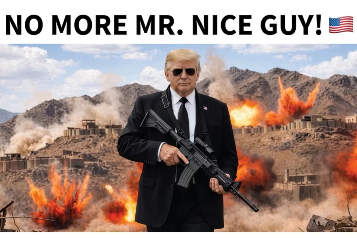 Paylaşımda Trampın hərbi əməliyyatlar fonunda təsvir olunduğu və üzərində "No more Mr. Nice Guy!" (yaxşı oğlan olmaq dövrü bitdi) yazısı olan fotoşəkil yer alıb.